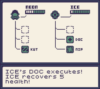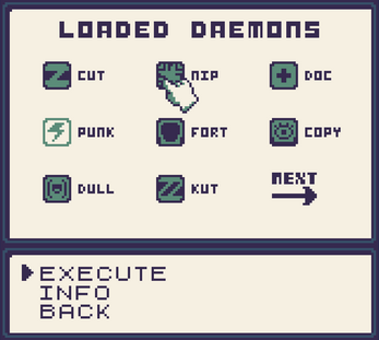 Battles in Netpunk are easy. Each round, both you and the ICE you're trying to breach will choose 3 DAEMONS. Then, those DAEMONS will be executed in alternating order of choosing. Rinse and repeat until the ICE is breached or you're flatlined!